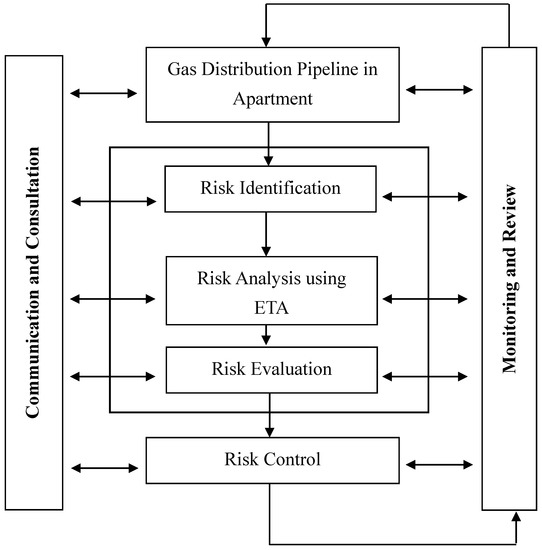 The procedures of this research are shown in Figure 1. First of all, problem identification was conducted, followed by literature study and data collection [16]. Subsequently, the risks caused by gas leakage in existing buildings were identified. Gas leakage analysis of the gas distribution pipelines in existing buildings was carried out using the ETA method. The result of the risk analysis, which was conducted to evaluate the risk of gas pipeline leakage, reflected the likely consequences of a gas leakage event [17]. The gas leakage analysis was performed for a gas distribution pipeline network in an existing building for the cases of small-scale leak, large-scale gas release, and pipeline rupture. The gas leakage analysis was done by determining the initiating event and then identifying pivotal or important intermediate events that occurred between the top event and the final state. Then, the event tree diagram was constructed by beginning with the top event, followed by the pivotal event and outcome risk that occurred from each path. The probability value of the failure event was determined for each top event and pivotal event. Then, the risk value was calculated for each outcome risk [14]. The top events of this study were small-scale leak, large-scale release, and pipeline rupture. The pivotal events for each scenario were ignition, delayed ignition, fire escalation, and evacuation. The risks that occurred from gas leakage were evaluated by risk level. Risk evaluation was conducted by comparing the calculated risk level in the risk analysis step with the standard criteria used. Subsequently, the result of the risk evaluation was used to determine the risk control program.