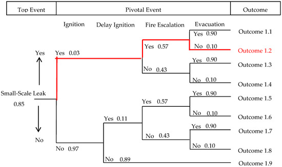 The top event in this scenario is the small-scale leak, and the pivotal events are ignition, delayed ignition, fire escalation, and evacuation. The probability value for a small-scale leak for a 4 inch pipeline is 0.85, and those for ignition and delayed ignition in an urban area are 0.97 and 0.89, respectively [9]. The probability values of a failure event leading to fire escalation and an evacuation of a multi dwelling building are 0.43 and 0.10, respectively [19]. Every pivotal event has a success and failure event, and every success and failure event can lead to different outcome risks. The outcome risk is a consequence of every path in an event tree diagram. The event tree diagram for the small-scale leak scenario is shown in Figure 2. Each outcome risk has a probability value for incurring an accident. The probability value of each outcome risk (Outcomes 1.1–1.9 in Figure 2) was calculated using Equation (1).