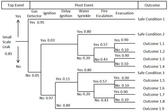 To reduce risk in the small-scale leak scenario, risk control is performed by installing a gas detector and a water sprinkler around the pipeline area. The installation of the gas detector and water sprinkler needs to be assessed to prove that the gas detector and water sprinkler can reduce risk. Figure 5 illustrates the assessment of the gas detector and water sprinkler installation in the small-scale leak scenario. Through the installation of a gas detector and water sprinkler, three safe conditions can be identified. The highest risk in the small-scale leak scenario (Outcome 1.2) is reduced to tolerable risk with a probability value of 1.5 × 10−5.