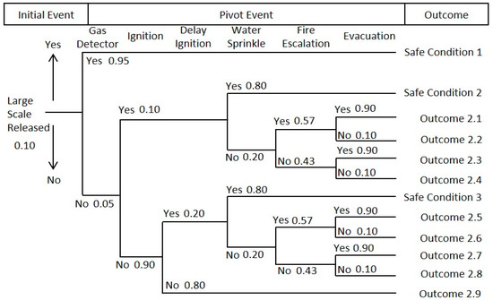 To reduce risk, installation of a gas detector and water sprinkler was also applied in the large-scale gas release scenario. Figure 6 illustrates the analysis in this scenario. After the installation of a gas detector and water sprinkler, three safe conditions can be identified. Outcome 2.2, representing the highest risk in the large-scale gas release scenario, is reduced to the tolerable risk category with a probability value of 5.7 × 10−6.