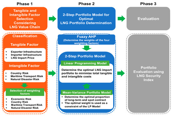 - Two-step portfolio model and fuzzy AHP for optimal LNG portfolio determination: The model in this study consisted of a two-step portfolio model combining the MV portfolio model and the LP model. In the first step, we applied the MV portfolio to determine the optimal purchase ratio between the long-term and spot contracts. The optimal purchase ratio was calculated considering the prices of long-term and spot contracts as well as the correlation between them. The optimal ratio was calculated using the cost–risk efficient frontier on the basis of the price levels of the term contract and spot trading as well as the correlation between them. The optimal purchase ratio was used as the constraint equation in the LP model. In the second step, we applied the LP portfolio model based on Biresselioglu’s [17] model to determine the optimal LNG portfolio. The optimal LNG portfolio that minimized the total tangible and intangible costs was determined. Fuzzy AHP was applied to calculate the weights.