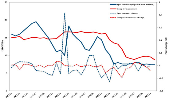 Figure 2 shows the spot and the average long-term contract price and the rate of price change between 2013 and 2015. Table 5 shows the descriptive statistics for price data.