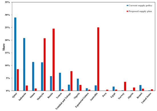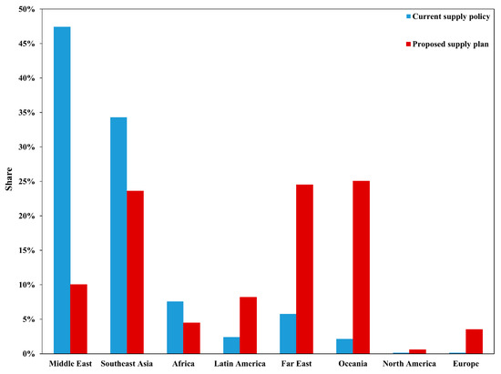 The proposed supply plan derived from the two-step portfolio shows that the supply volume from the Middle East and Southeast Asian regions decreases while that of the Far East and Oceania significantly increases. This is because the LNG unit price, national risk, and marine transportation risk in the Middle East are high. The supply volume from Southeast Asia is lower in the proposed plan than in the current supply policy because the risks of marine transportation and natural disasters are relatively high. In contrast, the supply volume from the Far East and Oceania, including Russia and Australia, considerably increases in the proposed supply plan because the risk of marine transportation and the unit price in these regions are lower than those in the Middle East and Southeast Asian regions. More specifically, the supply volume from all countries in the Middle East decreases. In Southeast Asia, the supply volume from Indonesia decreases significantly. This is because Malaysia’s supply price and maritime transport risks are lower than those in Indonesia. Brunei’s supply volume is slightly reduced. The supply volume from Latin America also increases. This is because the risk of marine transportation for countries in this region through the Pacific Ocean is much lower than that from countries in the Middle East, Southeast Asia, and Africa, which use high-risk sea routes. The opening of the Panama Canal has improved the region’s competitiveness. Considering this situation, the prediction of an increasing supply volume from Latin America is reasonable. In Africa, there are also high levels of political and marine transportation risk; however, the import unit price is lower than that in the Middle East, resulting in a slight decrease in the supply volume in the optimal portfolio. Currently, KOGAS participates in gas field development and the acquisition of equity in Mozambique.