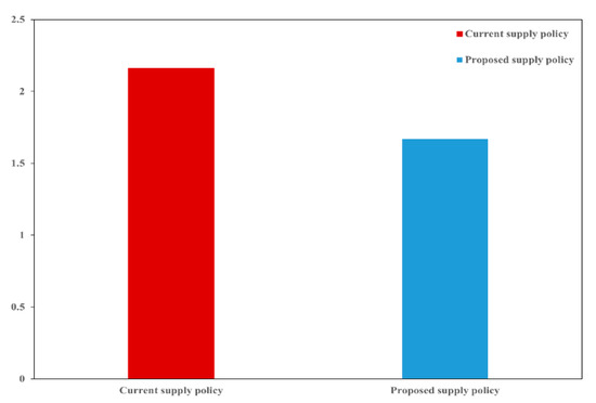 The results shown in Figure 6 represent the level of energy security evaluated in terms of diversification. A lower value means a higher level of energy security. By applying the current supply policy in Korea, the natural gas security index is shown to be 2.16. The result derived from the optimal portfolio is 1.67. These results indicate that the optimal portfolio has improved the energy security.