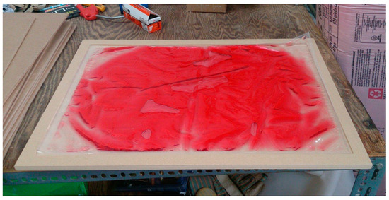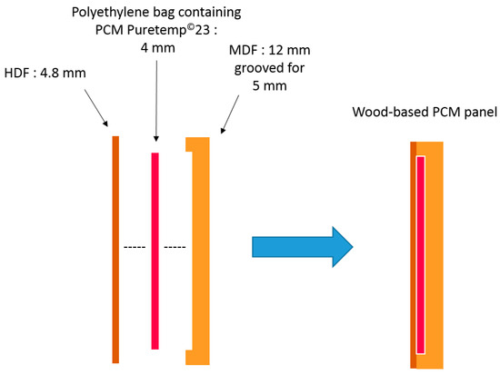 Medium Density Fibreboard (MDF) was sourced from Uniboard® (Laval, QC, Canada). It was used as the main component of the panels. MDF is a largely used wood product prepared from wood fibres combined and a urea formaldehyde resin by applying high temperature and pressure. The MDF panels were grooved through 5 mm, in order to contain the PT23 pouches. Such an assembly is shown in Figure 2.