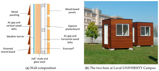 Two test huts were built specifically for the present study according to the National Building Code of Canada. Their wall composition is shown in Figure 3a. It is a common composition for a medium/high insulation building in the province of Quebec, Canada. Gypsum was added before the inner wood panels for fire safety considerations. Enermax© is a rigid panel made of wood fibre mixed with a wax emulsion. It is commercialized by the company BP Canada (Pontrouge, QC, Canada). It was added in order to reduce the thermal bridges caused by the wood studs. It also contains an aluminium barrier on its surface that acts as a vapor barrier. Rigid polystyrene insulation was fixed on the inner side of the door in order to avoid losing too much energy from a low cost badly insulated door. In a residential house, front doors are better isolated.