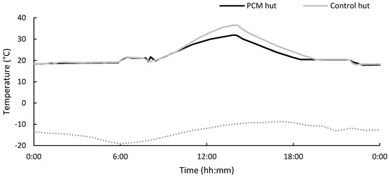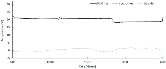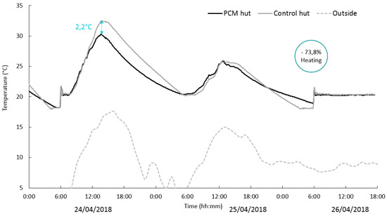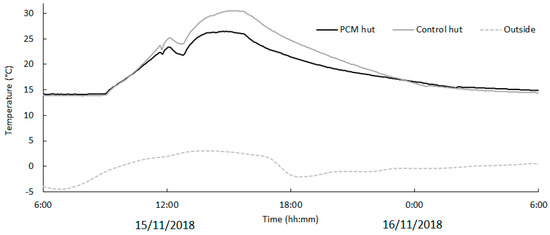 Temperature of the huts for a cloudy day (15/03/2018) is shown in Figure 6. This day, heating consumptions for the PCM and the control hut were 3.50 kW·h and 3.43 kW·h respectively. This represents a consumption 1.3% higher for the PCM hut, which is not significant.