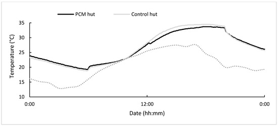 On this day, the PCM hut reached a maximum temperature 0.8 °C lower than the control hut. The night temperature, going as low as 12.9 °C, allowed the PCM to solidify, at least partially. With our experimental conditions, it was not possible to assess whether the PCM totally of partially melt. Similar observations were made for other summer days with cold nights as presented in Table 5. The PCM panels are able to reduce the overheating of the hut when the outside temperature was low enough during the night.