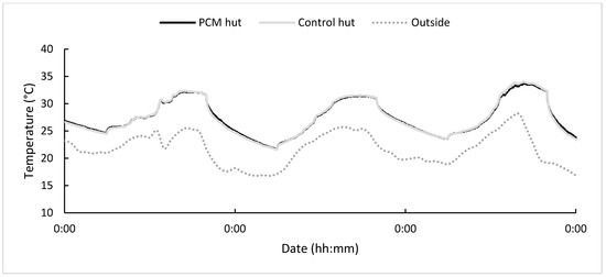 Temperature of the huts for consecutive summer days with hot nights (02/08/2018) is shown in Figure 9. The night temperature, which dropped at a minimum of 16.8 °C the 03/08/18 at 5 am, did not allow the PCM to solidify in a sufficient proportion, therefore the panels are unable to reduce the overheating during these days. For these days, the maximum peak temperature reduction is of 0.3 °C for the 04/08/18, which is not a significant result.