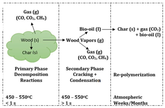 The secondary mechanism consists of cracking, recombination, and others [42,48]. In cracking, lower molecular weight molecules are formed by breaking volatile compounds [49]. By contrast, in the recombination process, volatile compounds combine into high molecular weight compounds, which may or may not be volatile [43,50]. In some cases, a secondary mechanism leads to the formation of secondary char [48,51].