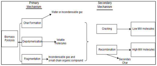 The biomass pyrolysis can be divided into two categories, such as primary and secondary mechanisms [41]. Figure 3 shows the detailed mechanism of the pyrolysis process. In the primary mechanism, volatile compounds are released, while the chemical bonds within the polymers are broken during biomass heating process [42,43]. Furthermore, rearrangement reactions within the matrix of the residue take place. Some of the volatile compounds which are unstable further undergo additional reactions, which are defined as a secondary mechanism.