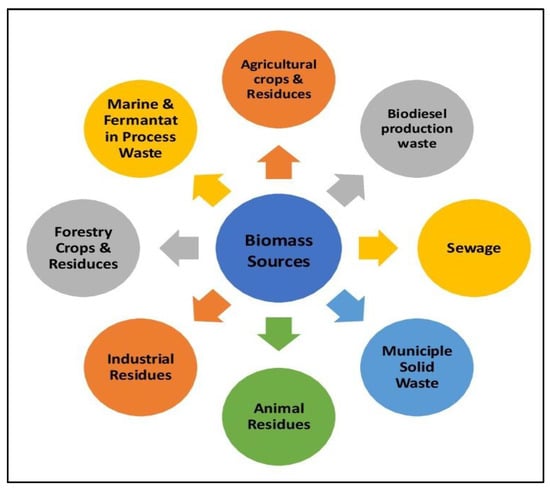 Biomass energy is currently recognised as the third largest global energy source. In many developing countries which have significantly large forest and agricultural land, 40–50% of energy usage is based on biomass. Green plants can directly/indirectly produce biomass using the photosynthesis process, by transforming sunlight into plant material [29,52]. The resources of biomass include various natural and derived materials, such as agricultural crops and residues, forest wood and leaf residues, municipal solid wastes (MSW), forest and mill residues, animal residues, and sewage. Agricultural crops and wastage (sugarcane, cassava, and corn) provide carbohydrate and starch. Roughly, the biomass species contain woody biomass, straw, beech wood, seedcakes, bagasse, and municipal solid waste (MSW) [53,54,55,56,57,58,59]. The available sources of biomass are shown in Figure 4.