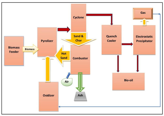 One part of the biomass is reduced to carbon, while the remaining part is oxidised and hydrolysed to carbohydrates, phenols, aldehydes, ketones, alcohols, and carboxylic acids, which combine to form more complex molecules such as esters, polymer products, and others [34,35,36]. Pyrolysis can be achieved by the complete absence of the oxidising agent. The practice of using air to perform pyrolysis is achieved by feeding air in an amount below stoichiometric; combustion occurs in only a small part of the biomass and, thus, the heat released in the combustion is used to keep the temperature of the reactor constant, while processing the reactions related to pyrolysis [37].