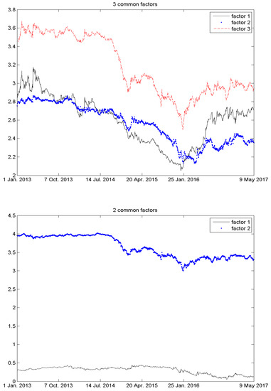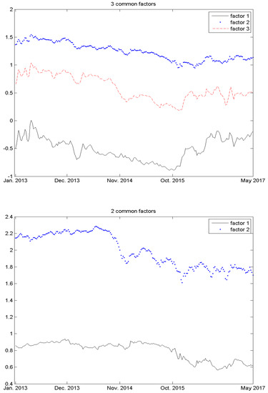 Permanent component in the decomposition (5) using the three and two common trends obtained from daily data on and , respectively. The sample spans the period January 2013–May 2017.