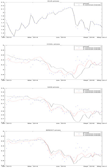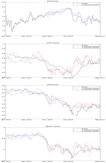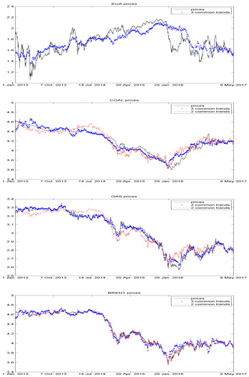 Figure 1, Figure 2 and Figure 3 shed further light on the dynamics of the common trends driving and at different frequencies. The results show overwhelming evidence of the differences between the permanent components driving the system of fuel prices when EUA prices are included and the permanent components when fuel prices are considered alone. These findings confirm the relevance of the EUA forward market in determining the dynamics of fuel forward prices. In particular, these figures show the existence of a very significant additional factor that influences the formation of fuel prices. The dynamics of these common factors are similar across data frequencies and provide further robustness to the results.