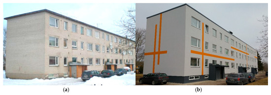 In Estonia, the majority of apartment buildings that have been constructed between WWII and 1990 have the same typical problems: high energy-consumption levels, insufficient ventilation (natural ventilation without any outdoor air inlets), uneven indoor temperatures, and insufficient thermal comfort levels [18,19,20]. From the year 2010, more than 1000 apartment buildings have undergone renovation, the majority of them supported by Fund KredEx. The energy renovation of 663 apartment buildings resulted in average energy savings of 43% [21]. The main challenge was to achieve the same level of heating energy consumptions as estimated by modeling before renovation [22].