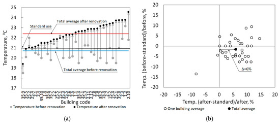 (a) Indoor temperature before and after renovation; (b) Indoor temperature performance gap from standard.