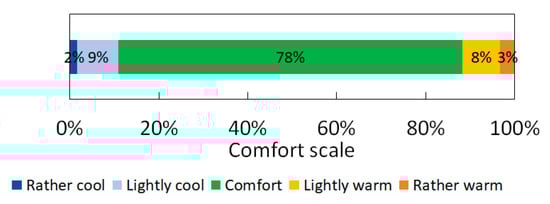 The lower and higher calculated Predicted Mean Vote (PMV) (values are −0.66 and 0.67 and maximum Predicted Percentage of Dissatisfied (PPD) value is 14.4%. From 120 apartments 10 are outside from neutral thermal comfort (−0.5 < PMV < 0.5) zone. Based on calculations 89.8% of apartments inside of comfort zone are satisfied. Based on this we can conclude that there was not large difference between the reported satisfaction and the satisfaction calculated based on measurements (Figure 4).
