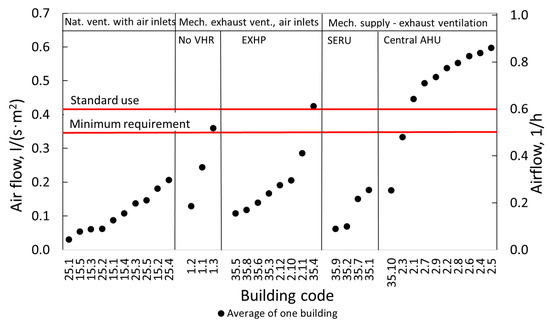 The average ventilation air change rate of old Estonian apartments with natural ventilation before renovation was 0.24 h−1 and 0.17 L/(s∙m2) [20]. The ventilation airflow after renovation of 0.36 h−1, 0.25 L/(s∙m2) (varied between 0.05 h−1 and 0.86 h−1, 0.03 L/(s∙m2) and 0.60 L/(s∙m2)) on average was much less than the standard value [28] for energy simulations 0.5–0.6 h−1; 0.35–0.42 L/(s∙m2) (Figure 6).