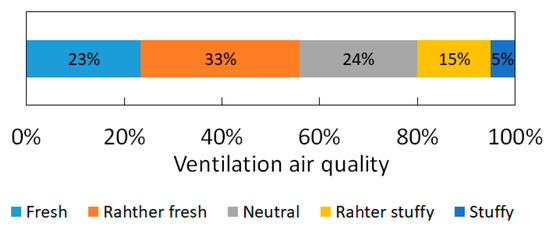 In every apartment, where indoor temperature and ventilation airflow were measured, we collected data regarding the appropriateness of the indoor temperature via a questionnaire (5 step scale: rather cool, slightly cool, neutral, slightly warm, and rather warm). Also, we asked a question on how they feel temperature after renovation (5 step scale: warmer, slightly warmer, neutral, slightly cooler, and cooler). In most buildings the ventilation system has been renovated. That is why we asked also how they evaluated ventilation air quality (5 step scale: fresh, rather fresh, neutral, rather stuffy, and stuffy).