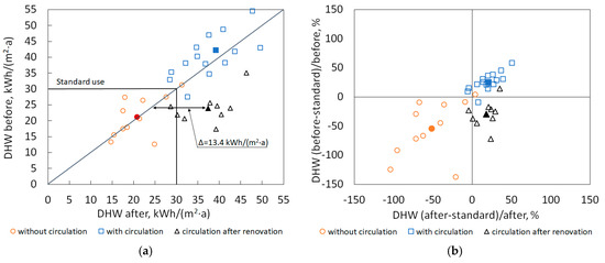 Figure 8b shows the gap between the measured and standard use of DHW. Almost all buildings where there was no DHW circulation before and after the renovation used less DHW energy compared to the standard use. The relative difference between the measured energy and standard use was 54% before renovation and 52% after renovation. On the other hand, buildings with DHW circulation had a higher DHW energy use compared with standard use: before renovation 26% and after renovation 20%. Hence, independently from the availability of DHW, the energy for DHW decreased a little. The main difference in the change in DHW use was apparent in buildings where DHW circulation was installed during renovation: energy for DHW increased 56%.