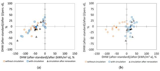 In the regulations, DHW use is defined as water use per heated area. In reality, an area does not use the water; it is the occupants in the building who do it. To analyze what is the better DHW use presenting unit—L/(pers.·d) or kWh/(m2·a), we measured energy use with average DHW usage per person (28 L/(pers.·d)) and with standard usage (30 kWh/(m2·a)) with and without DHW circulation (Figure 8a). We can see that in most cases, DHW use without circulation compared with standard use per heated area is lower; the average gap from the standard use in all buildings is −48% (Figure 9a). The gap between the standard use (kWh/(m2·a)) is −140% to +4%; from DHW use per person (L/(pers.·d)), it is between −61 and 40%. When we take into account DHW circulation, then we can see that the average use from standard use per heated area moves to the positive side and when hot water circulation is considered, then the average difference with standard use after renovation is +19%, which is between −5 and +50% (Figure 9b).