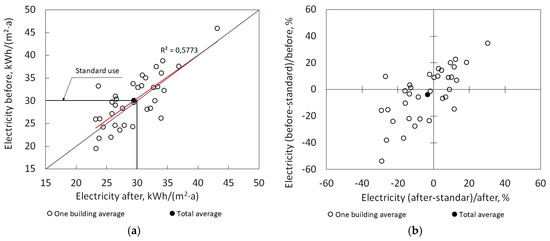 The renovation did not influence the average use of household electricity (apartments + common spaces): before renovation, it was 30.1 kWh/(m2·a), and after renovation, approximately the same, 29.5 kWh/(m2·a) (Figure 10a). In general, we see that the renovation did not change the use of electricity that much. The gap between the standard use, which has been taken without electricity use for ventilation (30 kWh/(m2·a)), is, on average, −3% before renovation (between −54 until 35%) and after renovation −4% (between −29 until 30%) (Figure 10b).