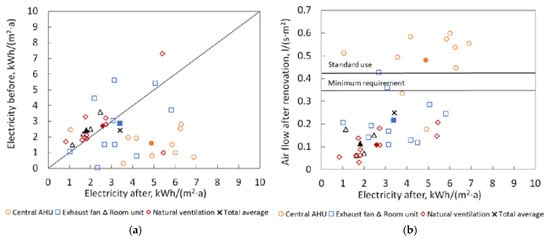 The use of electricity in common spaces (includes circulation pumps for DHW and heating, and electricity for central ventilation units) in all buildings was, after renovation, 0.9 kWh/(m2·a) higher (Figure 11a) than before renovation. The increase of the use of electricity in common spaces was significantly higher (p = 0.001) in buildings with central AHU compared with buildings with other ventilation types. Figure 11a, shows that in buildings with a central AHU, the average electricity use increased from 1.6 kWh/(m2·a) before renovation to 4.9 kWh/(m2·a) after renovation. Figure 11b, shows that after the renovation, airflow in these buildings was also higher than in other buildings (average 0.5 L/(s·m2)). An increase in the use of electricity in general spaces after the renovation was very small in buildings with other ventilation systems.