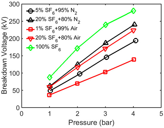 Figure 2 gives measured breakdown voltages in binary mixtures of SF6 with N2 and Air as a function of gas pressure in a uniform field gap [17]. For a given binary mixture, the breakdown voltage increases with increasing pressure as expected. Furthermore, it can be seen from Figure 2 that, at a given pressure, the breakdown voltage increases with the addition of the SF6 component in the binary mixtures. The related data in the literature for an SF6 + N2 mixture also confirm the dielectric performance in non-uniform fields compared to that of SF6 since an SF6 + N2 mixture is not prone to surface imperfections [18].