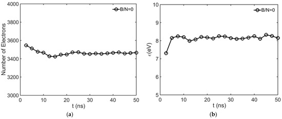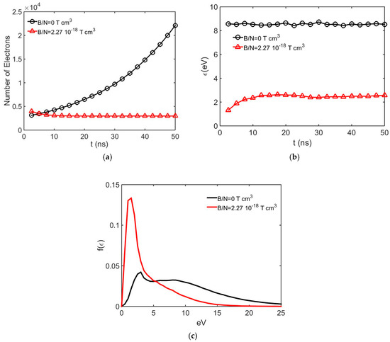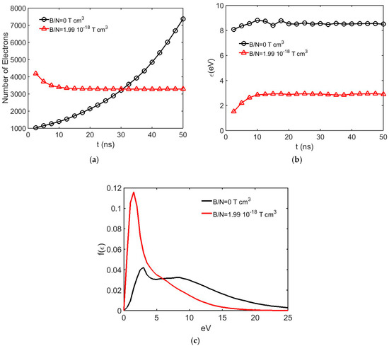 In Figure 7a, variation of the number of free electrons in crossed fields is shown at sampling times of 2.5 ns until 50 ns of simulation termination. It can be observed from this figure that the amplification in the swarm decreases as the magnetic field increases. Figure 7b shows the case in which the magnetic field is increased to a specific magnitude, resulting in inhibition of the electron avalanche. The initial loss of free electrons is basically a result of back diffusion as presented by Dincer et al. [10,24,30], and attachment collisions in the non-equilibrium region are also possible until a certain time interval, termed the relaxation time, for the electron swarm energy to be in equilibrium is reached. The relaxation time is also observed in Figure 7c from the variation of electron mean energies in the electron swarms. In Figure 7b, after 25 ns, plateau variation is observed, indicating that ionization collisions are balanced with attaching collisions in the equilibrium region. Therefore, in the plateau variation, the effective ionization coefficient is almost zero and this condition indicates that the electron avalanche is inhibited at B/N = 1.74 × 10−18 Tcm3.