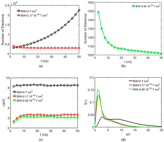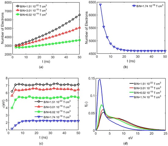 Figure 9 shows the electron avalanche development in the combined fields with various crossed magnetic fields in a 0.50% SF6 + 99.50% N2 mixture at 400 Td. As can be observed from Figure 9a, with the magnetic field removed, electron avalanche growth with a significant amplification is present, and the application of a magnetic field inhibits the growth. In Figure 9a, at B/N = 2.17 × 10−18 Tcm3, after 20 ns, plateau variation is observed, indicating that ionization collisions are balanced with attaching collisions in the equilibrium region. In Figure 9b, the B/N = 2.56 × 10−18 Tcm3 curve shows a similar trend, although the decay in the number of free electrons is still present, indicating that the attachment collision rate is higher than the ionization collision rate, defining the case to be slightly lower than the critical limiting condition. From Figure 9c, it can also be observed that the mean energy of the swarm in crossed fields is lower than that of the case without the magnetic field at a given E/N. The electron energy distributions displayed in Figure 9d also indicate the effect of the magnetic field as the peak of the distribution increases with an increasing magnetic field and shifts towards lower energy.
