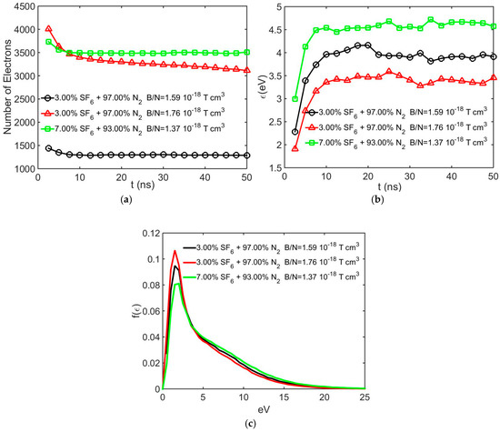 In Figure 11, swarm development in the combined fields in 3% SF6 + 97% N2 and 7% SF6 + 93% N2 mixtures are presented at E/N = 400 Td. Figure 11a displays the number of free electrons sampled at 2.5 ns intervals during the simulation time. From this figure, it is seen that, for the 3% SF6 component in the mixture, the avalanche growth is inhibited at B/N = 1.59 × 10−18 Tcm3 in the equilibrium region where the ionization collisions are balanced by attachment collisions. If the magnetic field is increased to 1.76 × 10−18 Tcm3, decay in the number of electrons is still present after 25 ns, although the swarm is in equilibrium, indicating that the attachment collision is higher than the ionization collisions. In the mixture with the 7% SF6 component, suppression of the avalanche at B/N = 1.37 × 10−18 Tcm3 is observed. The corresponding mean energies and energy distribution functions are presented in Figure 11b,c.