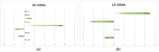 SC-Coal and LC-Coal. The positive elasticity values in Figure 2 reveal that natural gas and coal are a substitute for each other, while the negative ones denote a complementary relationship between them. This finding is contrary to developed countries, which present a substitutional relationship, but is in line with the Chinese reality of a coal-dominated energy structure. For instance, the value 3.864 of SC-Coal denotes a strong substitutional relationship between natural gas and coal in the short run. The value −2.458 of LC-Coal from Zhang et al. (2018) indicates that natural gas and coal consumption are complementary in the long run in the electric power generation and supply sector [19].