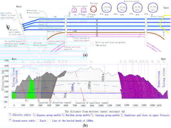 In the construction of the diversion system of the Jinping II hydropower station, the Jinping auxiliary tunnel A line and B line was first constructed. After that, four diversion tunnels and drainage tunnels were constructed to form seven basic parallel tunnels as shown in Figure 1a. The Jinping auxiliary tunnel was constructed by the drilling and blasting method, the standard section is the gate-shaped section with an excavation area of 45 m2 and the emergency stop area is the horseshoe-shaped section with an excavation area of 55 m2. The construction of the diversion tunnels combined the drilling and blasting method and the tunneling boring machine (TBM). The bid-section adopted by the drilling and blasting method is a horseshoe-shaped section excavated by the bench method. The diameter of excavation is 13 m, and the excavation area of the upper section is 110 m2. A cross-passage was set up every 500 to 600 m in the diversion tunnel. The section is a gate shape, and the excavation area is 60 m2 by drilling and blasting. In order to solve the safety discharge of gushing water and provide a transportation channel for the diversion tunnels, a drainage tunnel was built between the auxiliary tunnel B and diversion tunnel 4. The drainage tunnel was excavated with full section TBM, the excavation diameter is 7.2 m, and the excavation area is 41 m2.