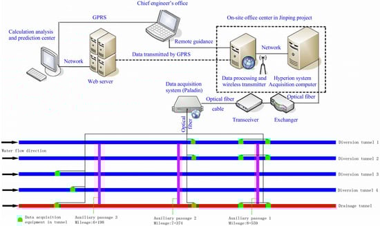 The MS monitoring system produced by the Canadian ESG (Engineering Solution Group) is employed in this project, which mainly consists of two parts of hardware and software. The system adopts the modular design method and implements the remote acquisition of PC configuration. The hardware part includes: MS sensor, Paladin sensor connection box equipped with power supply and signal waveform trimming function, Paladin (v.2)-24 bit seismic recorder, PMTS-Paladin master time server, fiber optic beam splitter, monitor and so on. The software includes: PAL-Paladin acquisition software, HNAS-Hyperion network acquisition software, Hyperion digital signal processing software and so on. The MS monitoring system for rockbursts for the Jinping II hydropower station is shown in Figure 3. An optical cable is preferred for data transmission, wireless transmission is used as an alternative, and on-site servers are real-time backup as an emergency to ensure data integrity. MS monitoring can be used for real-time monitoring, and network communication is employed to achieve global sharing.