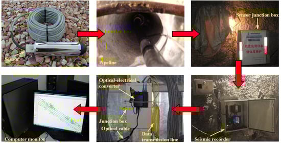 The working procedure of the MS monitoring system is as follows: First, the sensor converts it into a current wave after receiving the MS signal, and transmits the signal to the data conversion equipment through a customized cable between the sensor and the data acquisition equipment. Second, the data conversion equipment converts the current wave into a data signal, and transmits it to the data acquisition equipment through a network wire or optical fiber for acquisition and storage. Then, the MS data signal is processed and analyzed by the data processing software. Finally, according to the distribution of MS events, the risk area of rockburst can be predicted.