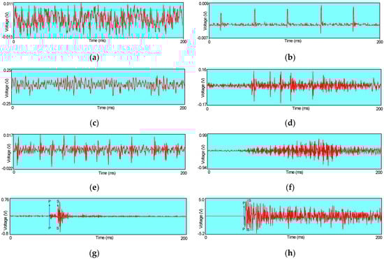 Waveforms of typical MS sources: (a) Electric current; (b) Knocking; (c) Rock drill; (d) Tunneling boring machine (TBM) construction; (e) Fan; (f) Locomotive whistle; (g) Microseisms; (h) Rockburst.