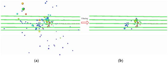 MS signals received by monitoring sensors must be processed and noise filtered to obtain MS signals that are useful for rockburst prediction. The main steps of the filtering method are as follows: (1) According to the pre-test results, the filter parameters of the acquisition instrument are set up and the hardware filter is carried out. (2) Synergetic filtering is proceeded by using the response of the sensor to noise signal differential reflection and sensitivity. (3) On account of the main effective signal being near the heading face and the sensor being located behind the heading face, filtering is performed according to the arrival time of the signal and the sensor position. (4) According to the noise database established in the test section, the artificial neural network method is used for filtering. (5) Finally, the noise is filtered through the oscillographic window of the monitoring system. The comparison of MS events before and after filtering is shown in Figure 7. The parameters of the MS events can be obtained by analyzing the waveform of the filtered MS events, the spectral spectrum, and the arrival time of the MS signals.