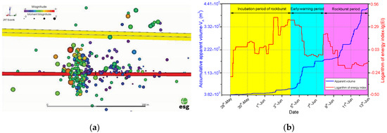 Significant characteristics of rockburst: (a) MS events before an extreme rockburst; (b) The apparent volume and energy index.