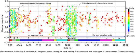 The distribution of cumulative MS events in 24 h from 19th June to 21st July is shown in Figure 9. In the statistical time period, there are two operation cycles per day for tunnel excavation, of which 00:00–01:30 and 12:00–13:30 are respectively the stages of the blasting operation. The data shows that there is a significant difference in the activity rate of MS events caused by the tunnel drilling and blasting method during different operation periods. The MS activity is at a quiet period from 05:00 to 08:00 and 17:00 to 20:00 every day. This is mainly due to the time for muck hauling and the early stages of shotcrete and bolting supports, the surrounding rock is not disturbed by excavation and the surrounding rock is in a quiet period. Because there is a small disturbance to the surrounding rock due to the shotcrete and bolting supports, the surrounding rock stress is adjusted to a small extent, and the subsequent drilling operations further aggravate the disturbance of surrounding rock, so that the MS activity from 08:00–12:00 and 20:00–24:00 has a certain increase. The maximum number of MS events occur within 1.5 h after the tunnel excavation unloading (00:00 to 02:00 and 12:00 to 14:00) and then decrease rapidly. This indicates that the unbalanced stress caused by excavation unloading in a short time has been adjusted to a great extent, resulting in the most severe activity of the surrounding rock micro-fracture and the most strain energy released by the surrounding rock, which then tends to ease. The drilling and blasting method is an instantaneous unloading, and the strain energy is mainly concentrated over several hours after blasting, especially in the release of 1.5 h.