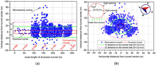 The stress adjustment range of the surrounding rock after the tunnel excavation is closely related to the tunnel diameter. In order to make the findings universal and easy to compare with other projects, the diameter D (12.4 m) is used to represent the distance between the events and the tunnel wall to analyze the distribution of MS events in the radial and axial directions of the tunnel as shown in Figure 10. The center of the heading face is the origin and the tunnel excavation direction is the positive direction of the coordinates. The events are mostly distributed in the range of 2D from the tunnel wall, especially within 1D from the tunnel wall which are the most intensive. It can be seen that a large number of micro-fractures are generated in the surrounding rock within 1D from the tunnel wall. There is high stress concentration and a large amount of strain energy in this area, which provides the energy source for rockburst. From the distribution around the tunnel wall, the events are mainly concentrated near the heading face, the tunnel side wall, and the left spandrel, while the events produced by the arch bottom are fewer and discrete. This indicates that there is high-stress concentration near the dense area of MS events, which will accumulate a large amount of strain energy and pose a high risk of rockburst, and needs high attention. However, the probability of rockburst is low at the arch bottom due to less micro-fracture and less accumulation of strain energy.
