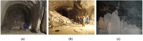 Rockburst in auxiliary tunnels: (a) Extremely strong rockburst; (b) Induced collapse; (c) Support structure damage.