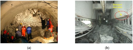 Rockburst in drainage tunnel: (a) TBM is buried; (b) 80 mm steel plate is damaged.