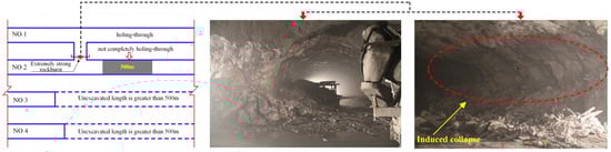 The stress is repeatedly adjusted during the construction process because of the alternately heading forward of diversion tunnel 1 and 2. The extremely strong rockburst occurred at the position of 20 m behind the holing-through of diversion tunnel 1, resulting in a 2 m deep rockburst pit and inducing collapse of about 300 m3 on the left side of the arch waist and the side wall as shown in Figure 14.
