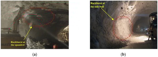 In the section of high in-situ stress, the rockburst in the diversion tunnels is mainly medium and strong rockburst, but the proportion of rockburst length is much smaller than that in the auxiliary tunnels and the drainage tunnel with smaller excavation size. The sizes of the rockburst pits are no more than 2 m, and there is no occurrence of rockburst on the heading face and no extremely strong rockburst. The medium to strong rockburst of the tunnel spandrel and side wall is shown in Figure 15.