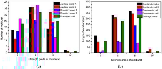 Rockburst statistics in auxiliary tunnel, diversion tunnel and drainage tunnel: (a) The number of rockbursts: (b) The length of rockburst.