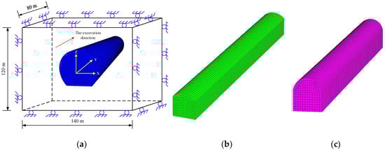 Three-dimensional numerical model: (a) Diversion tunnel; (b) Cross passage; (c) Auxiliary tunnel.