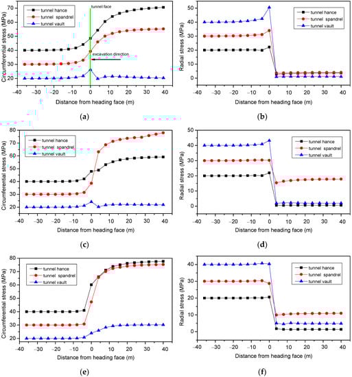 The variation of the circumferential stress and radial stress during excavation in the three locations of the tunnel, hance, spandrel, and vault is shown in Figure 18. It can be seen that the radial stress of each monitoring point after excavation decreases rapidly, and the value is basically within 10 MPa. However, the circumferential stress is quite different, and the value in tunnel hance and spandrel increases significantly after excavation, while the vault position changes little. The growth rate of the circumferential stress at the tunnel hance of the diversion tunnel is much higher than that of the spandrel and vault, especially in the range of 10 m from the excavation face. It indicates that the rockburst is more likely at this location, which is confirmed by the rockburst record on the site. The variation of circumferential stress in the spandrel of the cross-passage is the largest, followed by the hance, and the vault is the smallest. It is shown that the possibility of rockburst occurring in the spandrel is greater under the same stress condition as the diversion tunnel. The circumferential stress in the spandrel and vault of the auxiliary tunnel is larger, and the maximum stress value is 80 MPa. Rockburst is more likely to occur in the vault and spandrel positions, as evidenced by the rockburst statistics at the Jinping auxiliary tunnels.
