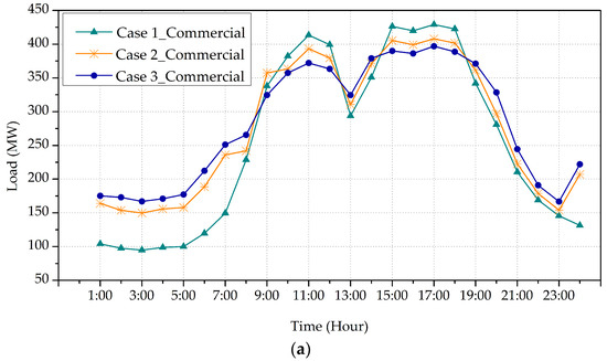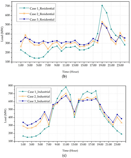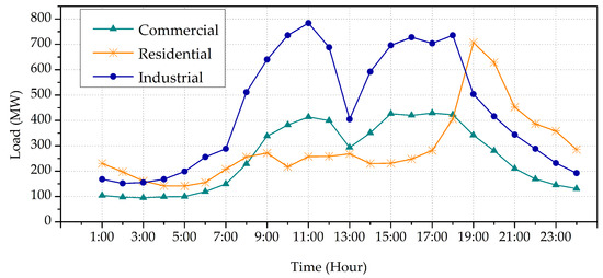 The electricity customers are categorized into three types, i.e., commercial customers, residential customers, and industrial customers. The reference load profiles of customers, which are modified on the basis of load profiles from [24], are shown in Figure 1.