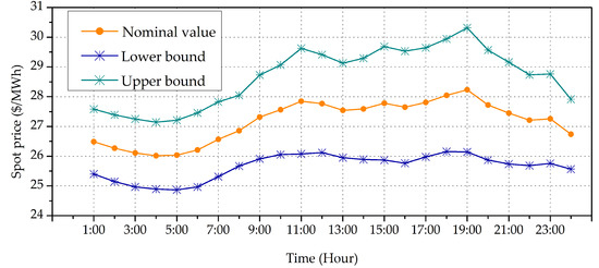 As mentioned before, the spot price is difficult to forecast due to its volatility, but one can still determine a reasonable range for according to statistical data. Here, each is an independent, symmetric and bounded stochastic coefficient which takes values in with , where is the maximum possible deviation from the nominal spot price [44].